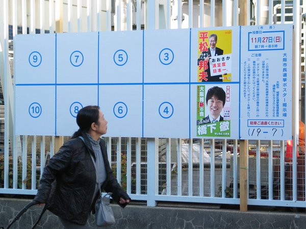 We have an election for the mayor of Osaka on 27th November. A woman was walking by the election board with a look at two candidates.